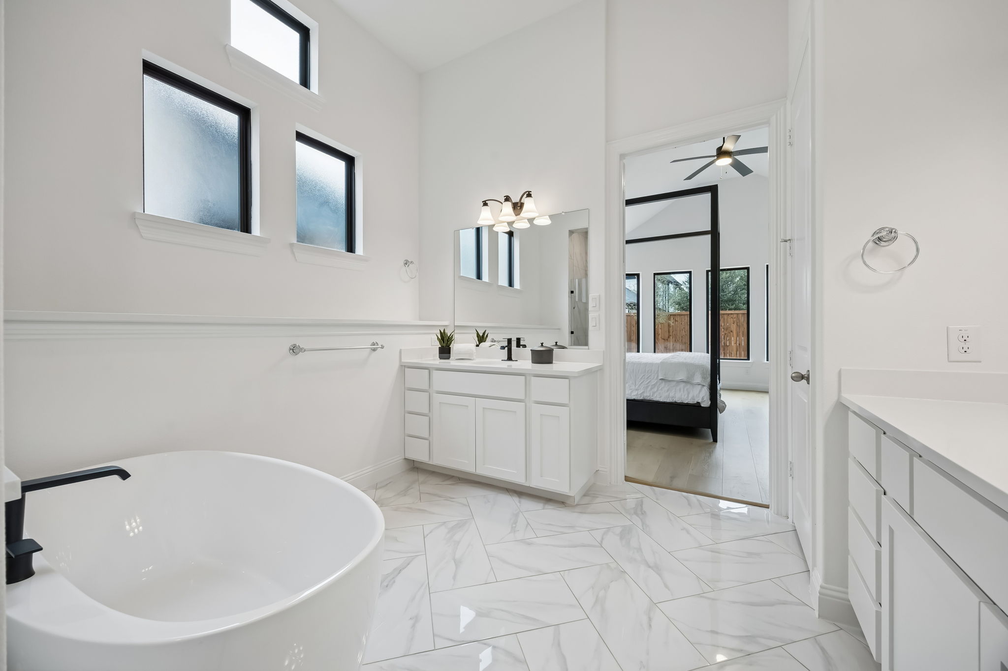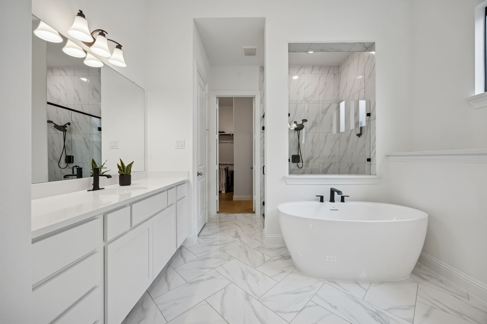 A freestanding soaking tub, elevated tile compositions, frameless glass showers, and designer plumbing fixtures create a calm, restorative environment inspired by private luxury spa experiences.
