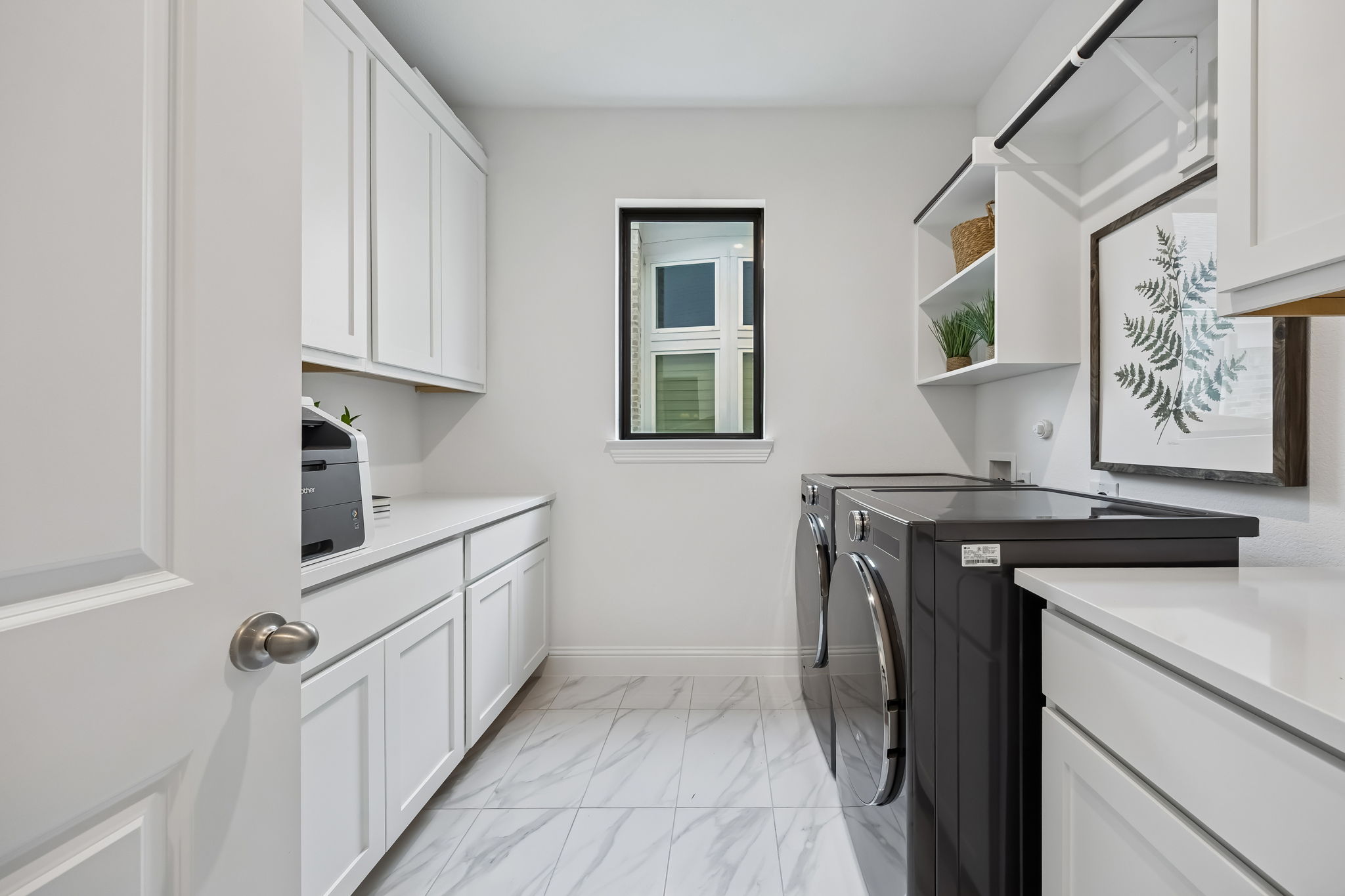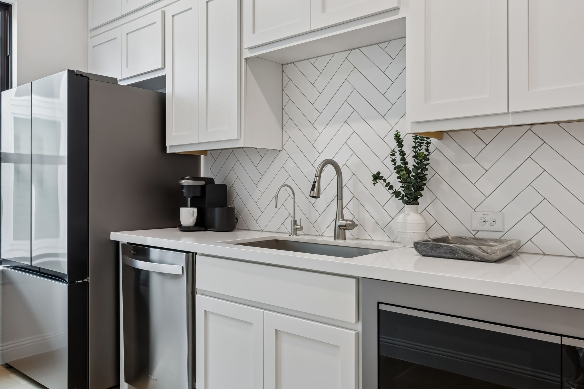 Elegant Quartz countertops, stacked cabinetry, upgraded appliances, sculptural lighting, and a striking brushed-gold pot filler define a kitchen that is both visually commanding and purposefully designed for gathering, hosting, and daily living.